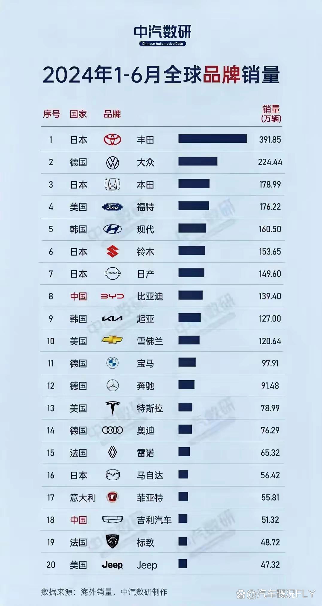 2024年1~6月全球汽车品牌销量排行榜,前20名当中只能看到比亚迪和吉利,从这个角度来看,国产车想要超越合资车,还需要一些时间,至少国际上不认可! 不过,比亚迪和吉利作为国内最牛的车企,其发展历史只有短短30年,能成长到现在的高度,其在国内的销量比丰田和大众还要牛,不得不说,这样的车企已经算是超级成功了! 下一步,国产车要出口海外,在全球市场摸爬滚打!